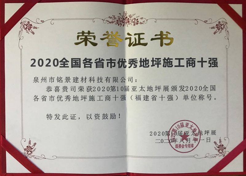 熱烈慶祝泉州市銘景建材科技有限公司榮獲2020全國各省市優(yōu)秀地坪施工商十強(qiáng)!